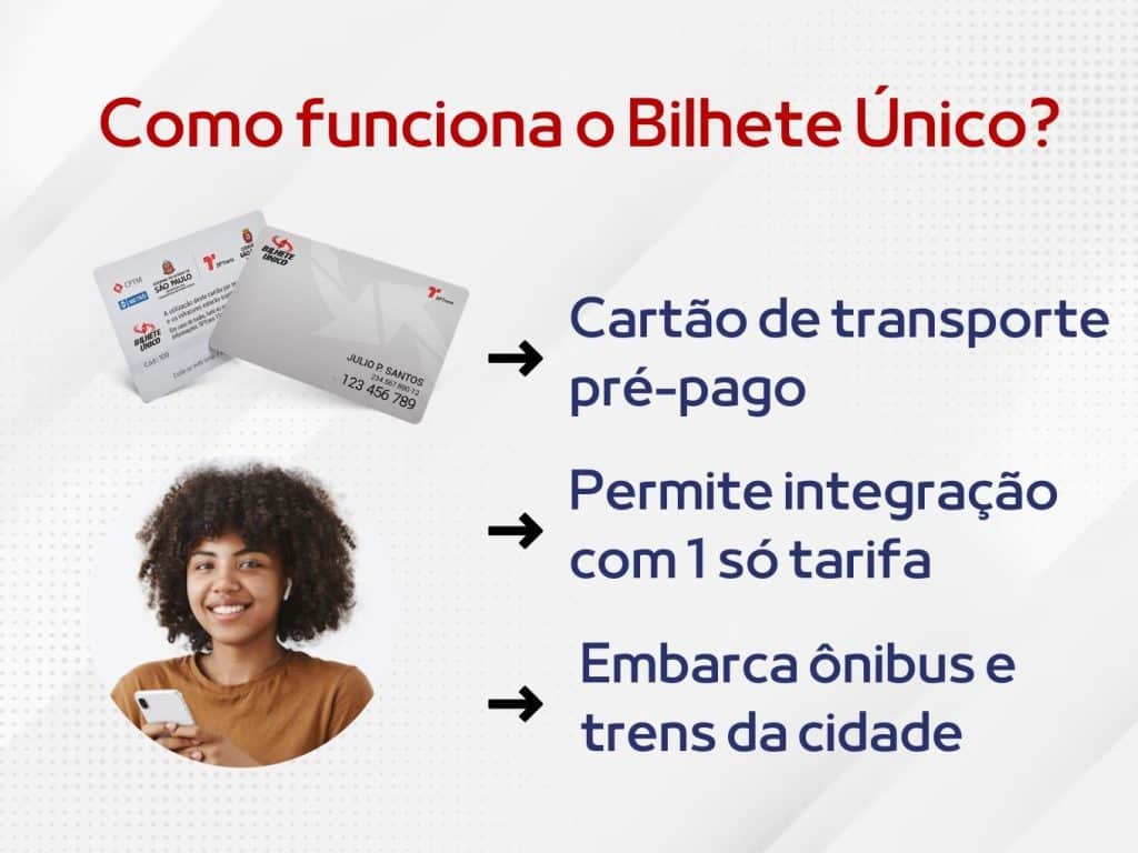 O Bilhete Único é um cartão de transporte que funciona na modalidade de pré-pagamento. Ou seja, o utilizador insere créditos em seu cartão e pode usá-lo para pagar passagens de transporte coletivo depois, quando precisar.