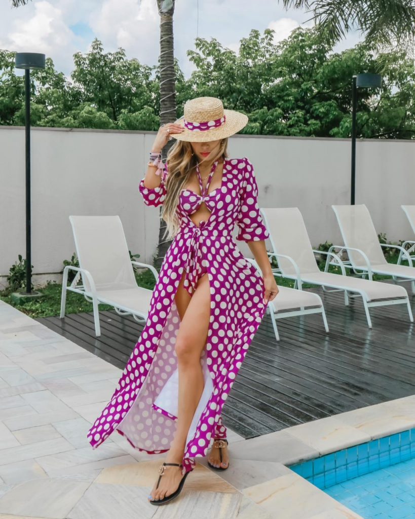 Não há como falar de roupas de verão sem citar as saídas de praia e os biquínis. Para o look, Vanessa apostou no roxo com estampa em poá, atemporal e moderna em simultâneo. O chapéu de palha possui detalhes com o mesmo tecido. “Um visual divertido e instagramável para dias quentes”, define.