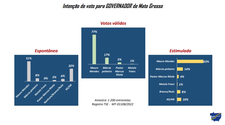 A segunda rodada da pesquisa do Instituto MT Dados, divulgada nesta sexta-feira (23.09), aponta que o governador e candidato à reeleição Mauro Mendes (União) tem 77% dos votos válidos. O resultado da pesquisa estimulada mostra que Mauro está 60 pontos percentuais à frente do segundo colocado na pesquisa.