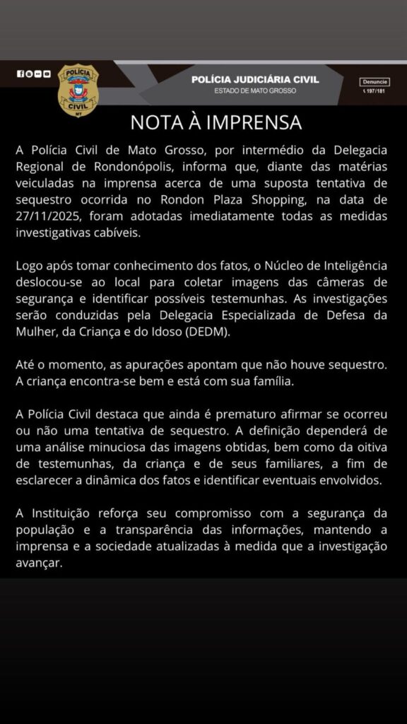 A Polícia Civil de Mato Grosso informou, por meio de nota, que as investigações realizadas até agora não apontam para a ocorrência de sequestro envolvendo uma criança no Rondon Plaza Shopping, em Rondonópolis, nesta quinta-feira (27).