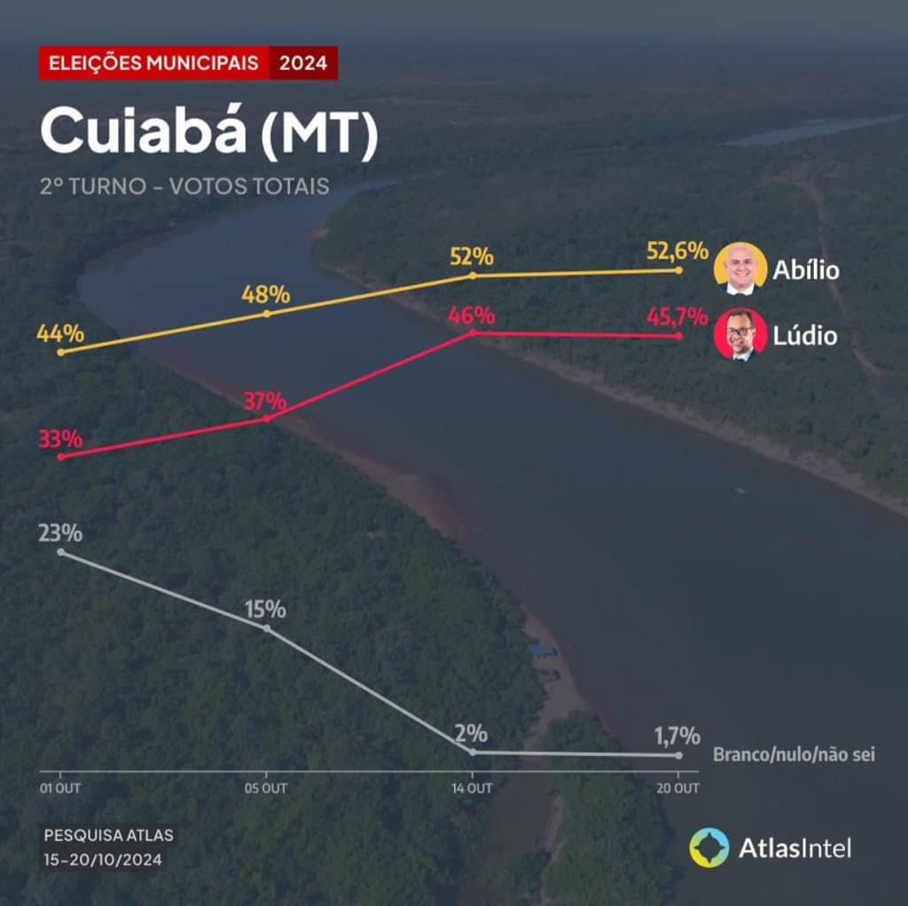 Um novo levantamento divulgado nesta terça-feira(22.10) do instituto AtlasIntel mostra que Abílio Brunini(PL), candidato à prefeitura de Cuiabá, lidera as intenções de voto com 52,6% ante 45,7% de seu adversário, Lúdio Cabral (PT). Os votos brancos e nulos dos eleitores cuiabanos somam 1,7%.