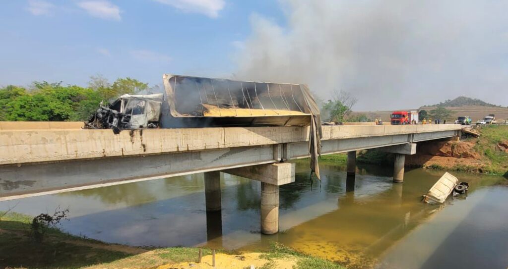 As informações iniciais apontam para uma colisão lateral, seguida de tombamento e incêndio. Um dos vagões do veículo carregado com milho caiu no rio. O caminhão está carregado com tijolo e brita e parte da carga também derramou.