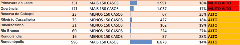 Com isso, a possibilidade de um lockdown está praticamente descartada, apesar de municípios da região como Primavera do Leste, Guiratinga e São José do Povo aparecerem como nivel muito alto.