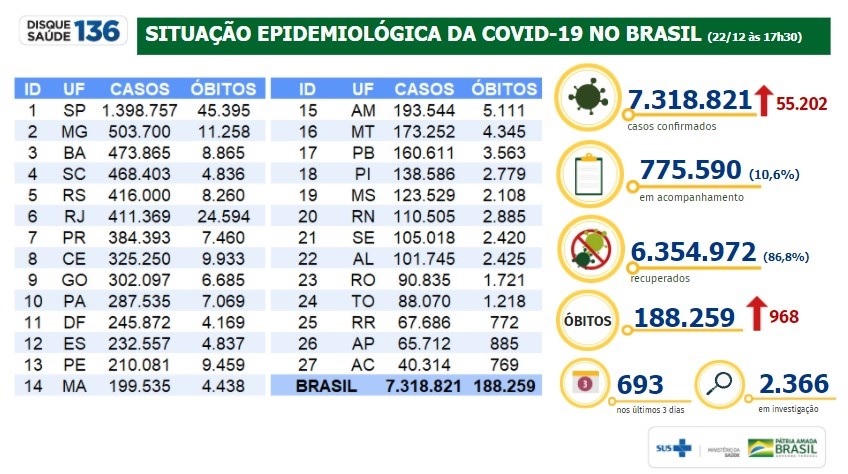 As iniciativas e ações estratégicas são desenhadas conforme a realidade e necessidade de cada região, junto com estados e municípios, e têm ajudado os gestores locais do SUS a ampliarem e qualificarem os atendimentos, trazendo respostas mais efetivas às demandas da sociedade. Neste momento, o Brasil registra 7.318.821 de casos confirmados da doença, sendo 55.202 registrados nos sistemas nacionais nas últimas 24h.