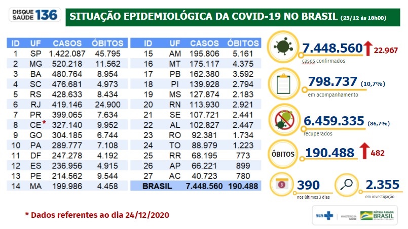 O registro de pessoas curadas já representa a grande maioria do total de casos acumulados (87%). As informações foram atualizadas às 18h desta sexta-feira, (25/12) e enviadas pelas secretarias estaduais e municipais de Saúde. Ressalta-se que o Ceará não informou os dados na presente data, por conta de problemas técnicos da Secretaria de Saúde do Estado.