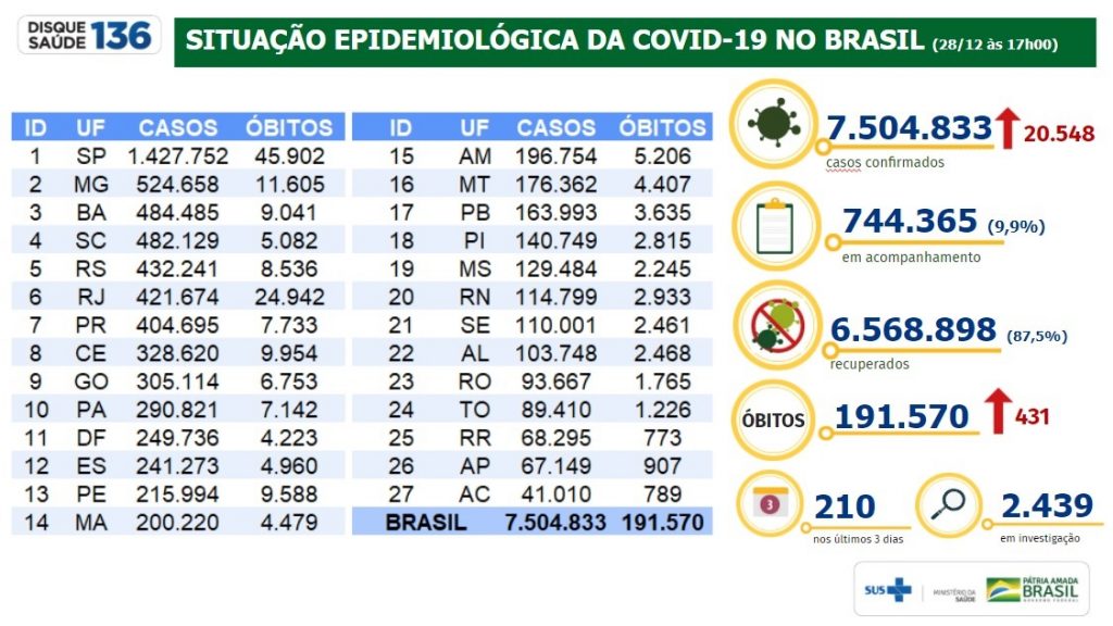 As iniciativas e ações estratégicas são desenhadas conforme a realidade e necessidade de cada região, junto com estados e municípios, e têm ajudado os gestores locais do SUS a ampliarem e qualificarem os atendimentos, trazendo respostas mais efetivas às demandas da sociedade. Neste momento, o Brasil registra 7.504.833 de casos confirmados da doença, sendo 20.548 registrados nos sistemas nacionais nas últimas 24h.