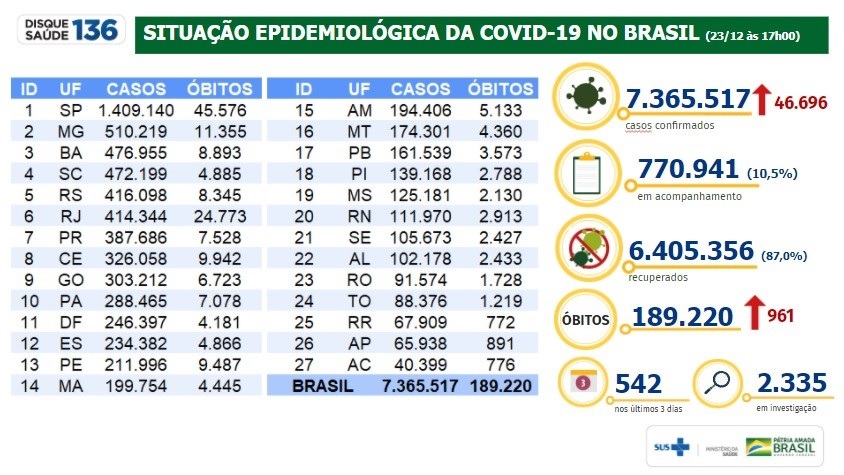 O registro de pessoas curadas já representa a grande maioria do total de casos acumulados (87%). As informações foram atualizadas às 17h desta quarta-feira (23/12) e enviadas pelas secretarias estaduais e municipais de Saúde.