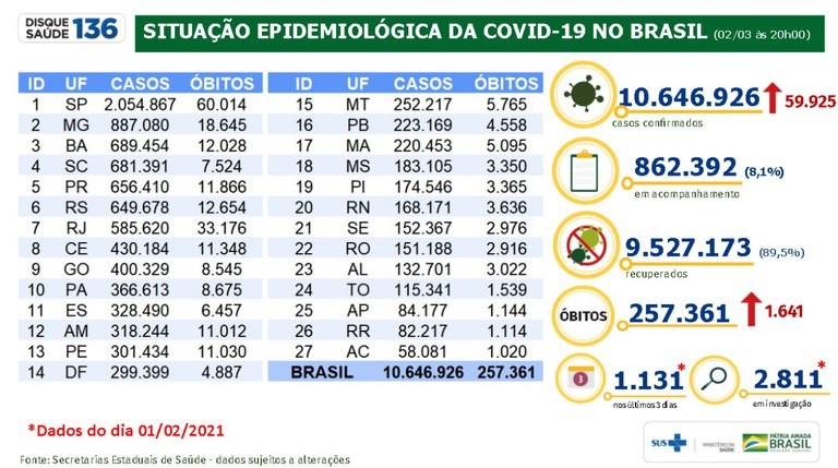 Em relação aos óbitos, o Brasil tem 257.361 mortes por coronavírus. Nas últimas 24h, foram registrados 1.641 óbitos nos sistemas oficiais, sendo que 1.131* óbitos ocorreram nos últimos três dias. Outros 2.811* permanecem em investigação.