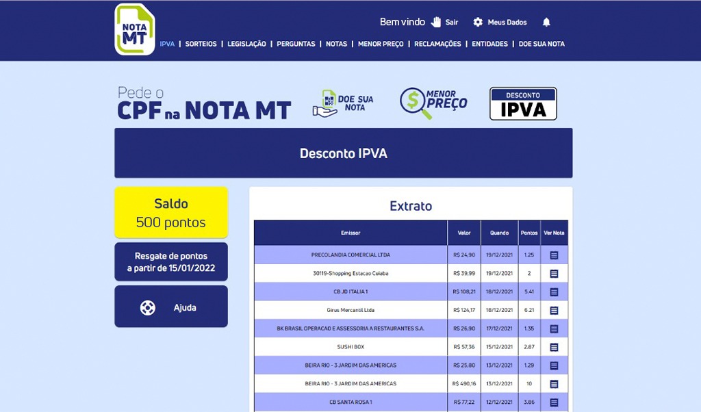 Os usuários cadastrados no Programa Nota MT e que pedem o CPF na nota já podem consultar seu saldo de pontos que será utilizado para ter o desconto no Imposto sobre a Propriedade de Veículos Automotores (IPVA), limitado a R$ 100. Por enquanto, a funcionalidade está disponível apenas no site www.nota.mt.gov.br, na opção “Desconto IPVA”. A previsão é de a pontuação apareça no aplicativo de celular nas próximas semanas.