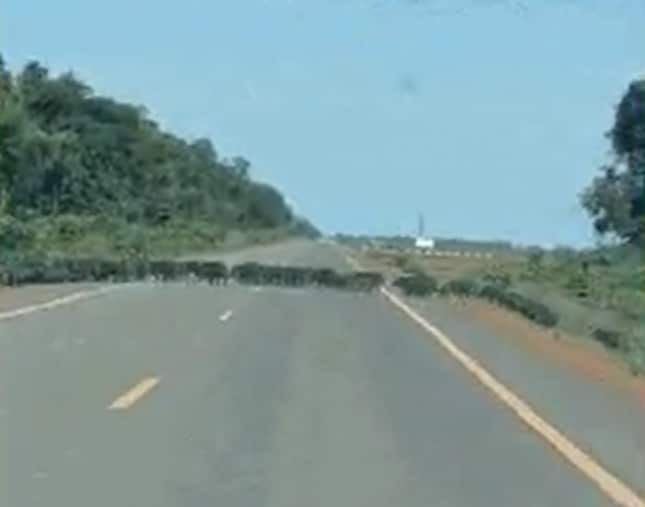 Assim que atravessou a pista, o bando caiu em um buraco na terra. Nas imagens, é possível ver o grupo se debatendo até conseguir sair e voltar a andar, todos juntos.