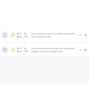 Segundo informações que consta no site climatempo, na próxima segunda-feira (21) e terça-feira (22), ocorrerá pancadas de chuva e céu com muitas nuvens.