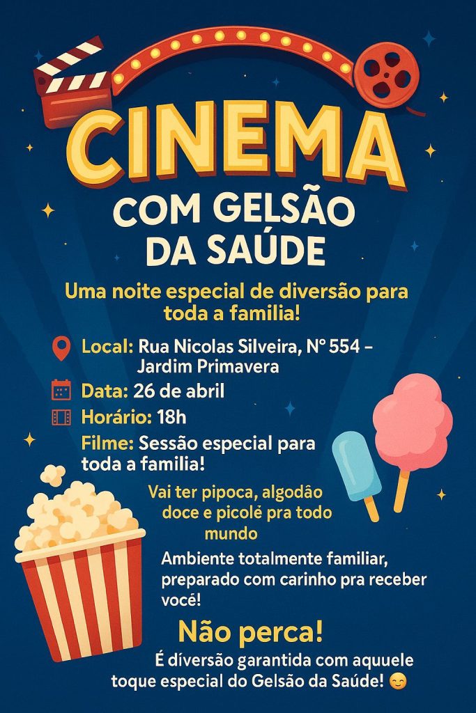 No próximo sábado, dia 26 de abril, às 18h, o Jardim Primavera será palco de uma sessão especial de cinema ao ar livre, idealizada pelo vereador Gelsão da Saúde. O evento, totalmente gratuito, promete oferecer uma experiência divertida e acolhedora para toda a família.