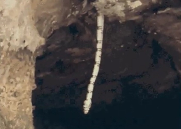 Um vídeo registrado pela guia Joana D’arc mostra o momento em que a cobra sai de um buraco até o chão da caverna. Mesmo após a cabeça tocar o solo, o restante do corpo continua deslizando de forma impressionante.