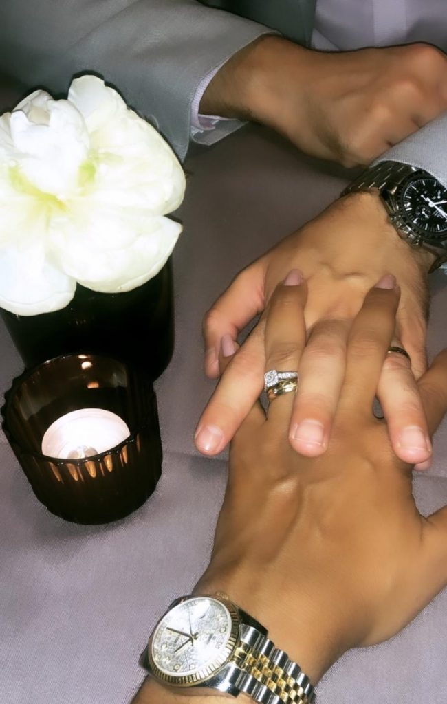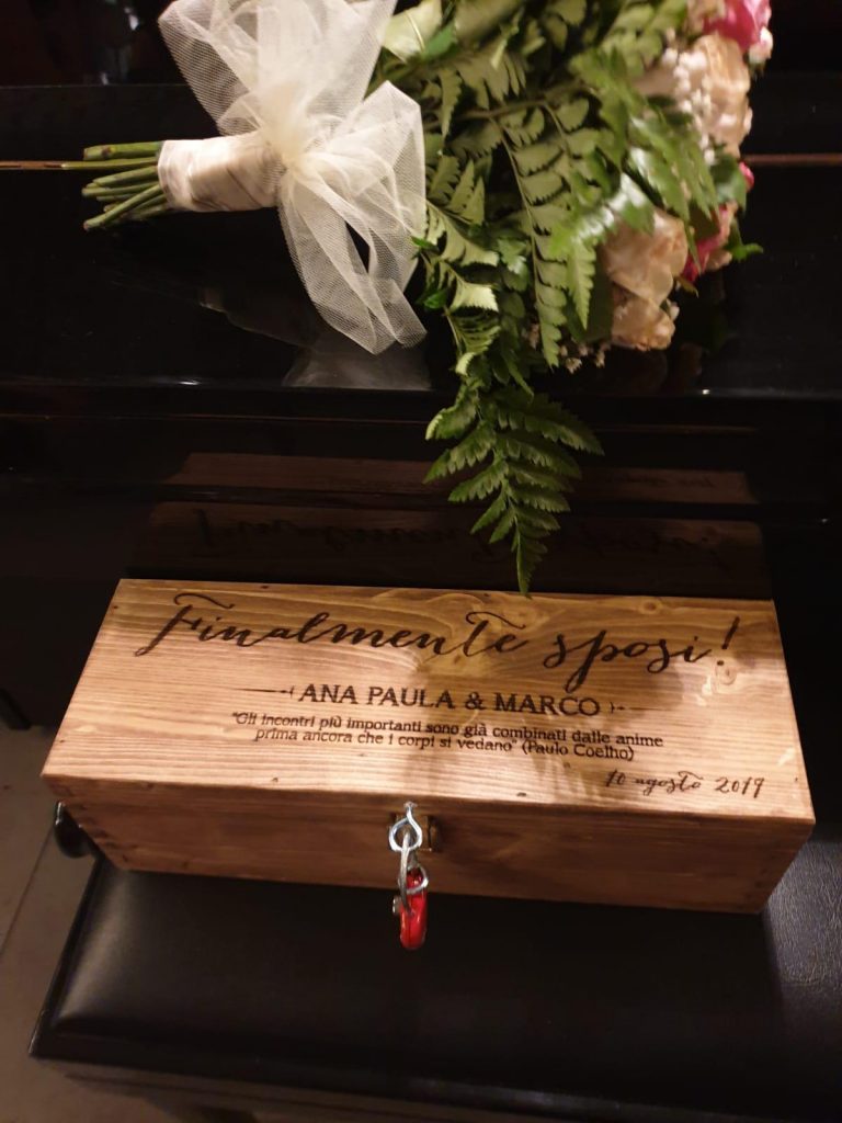 “Esse presente especial ganhamos da minha sogra quando casamos a um ano atrás , tem data gravada na caixa.Dentro tem um vinho precioso e ela fez a gente escrever uma carta falando o que sentimos quando casamos, sem vermos o que o outro escreveu e colocamos dentro. Abriremos o vinho daqui 4 anos, antes eram 5, rs…”. Disse Ana Paula, que teve a cerimônia religiosa e festa em um luxuoso castelo em Roma adiada para o próximo ano, devido a pandemia.