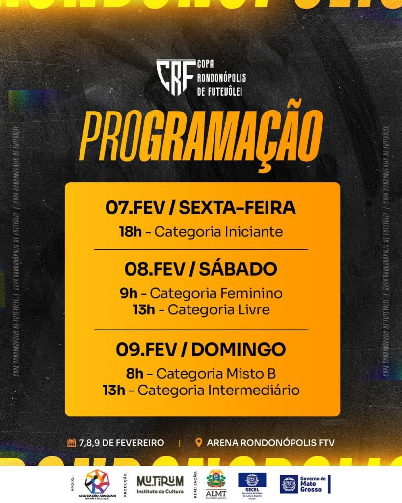 Os jogos da categoria Feminino acontecerão no sábado (08), a partir das 8h, em duas quadras disponíveis na Arena Rondonópolis FTV. Ainda no sábado, a partir das 13h, acontecem os jogos da categoria Livre. No domingo será a vez dos jogos das duplas das categorias Misto B, pela manhã (8h), e categoria Intermediário, à tarde, a partir das 13h.