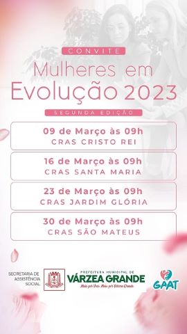 A secretária de Assistência Social, Ana Cristina Vieira, disse que o ‘Mulheres em Evolução’, neste ano de 2023,  terá início no dia 9 de março, no Centro de Referência em Assistência Social, do bairro Cristo Rei.  “Serão quatro semanas, onde estaremos nos reunindo com as mulheres que participam de programas sociais ou moradoras da região. Todas estão convidadas a participarem desse movimento, que tem como maior inspiradora a primeira-dama Kika Dorilêo Baracat”, anunciou.