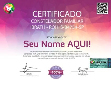 Ao concluir a formação, o terapeuta torna-se um Constelador Familiar certificado pelo IBRATH. Este certificado, que possui 180h de formação, também inclui um selo holográfico, RQH (Registro de Qualidade Holístico), CNPJ da mantenedora, CPF do profissional e um cronograma detalhado no verso. Estes elementos garantem a legalidade e reconhecimento do profissional perante a legislação brasileira.