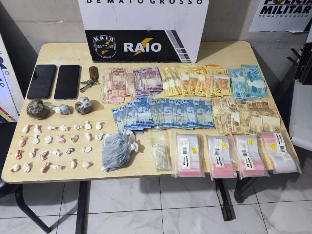 Policiais militares da Companhia de Rondas e Ações Intensivas Ostensivas (Raio) do 1º Comando Regional prenderam dois homens faccionados, de 20 e 40 anos, por tráfico ilícito de drogas, na noite desta segunda-feira (10.11), em Cuiabá. Com a dupla, foram apreendidas porções de maconha e cocaína, além de R$ 2,2 mil em dinheiro.