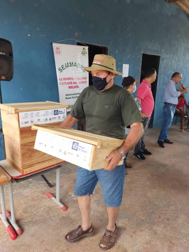 A comunidade rural do Assentamento de Sadia III está sendo incentivada a promover a apicultura em Várzea Grande. Cinquenta caixas de abelhas foram distribuídas para residentes do local, sendo 5 unidades para cada família, que manifestou interesse pela atividade. Em média, cada caixa pode render de 40 a 60 quilos de mel, por ano. A ação que visa promover a apicultura no município, bem como fomentar a produção de alimentos, a geração de renda e a preservação ambiental nas propriedades rurais, é uma parceria entre a Secretaria de Meio Ambiente e Desenvolvimento Rural e Sustentável e a Secretaria de Estado de Agricultura Familiar e Assuntos Fundiários – SEAF.