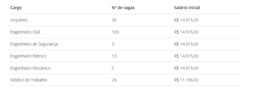 Ao todo, serão 184 vagas distribuídas entre seis cargos. A maior parte é para engenheiros civis, mas também há oportunidades para arquitetos e médicos do trabalho. Os salários variam de R$ 11.186,00 a R$ 14.915,00.