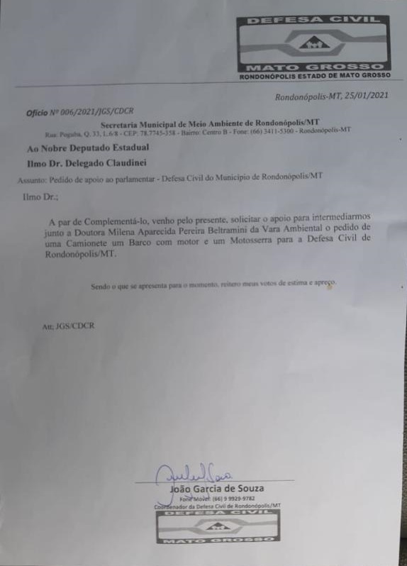 “Estaremos juntos na busca de atender essas demandas. Vamos conversar com o Poder Judiciário, intermediando junto à juíza Milena Aparecida Pereira Beltramini da Vara Ambiental de Rondonópolis. A coordenadoria da Defesa Civil faz um trabalho importantíssimo e carece desses equipamentos”, afirmou o Delegado Claudinei.