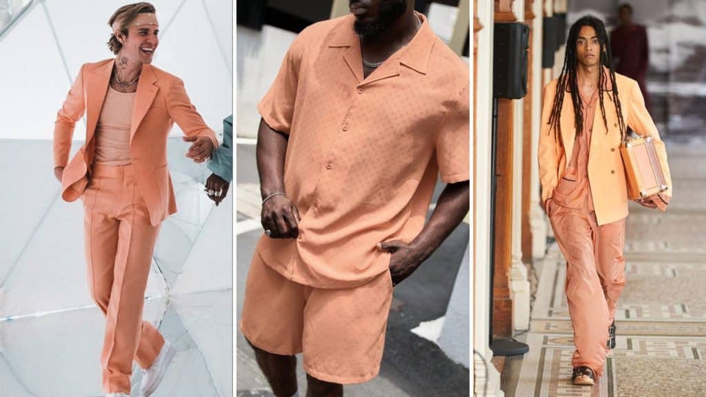 Para os homens, os visuais podem seguir o mesmo caminho. A clássica alfaiataria masculina ganha excentricidade com as cores do ano. A ideia de incorporar o pêssego nessas modelagens já agradou até mesmo o cantor Justin Bieber, dono do hit “Peaches”, pêssegos em inglês.
