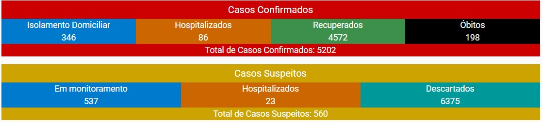 Os números constam no relatório divulgado no final da tarde deste domingo (9) e de acordo com o levantamento, o total de casos passou de 5142 para 5202 entre ontem e hoje e as mortes saltaram de 193 para 198.