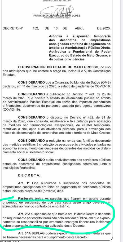 Apesar de representar um alívio aos servidores a não cobrança desses empréstimos por 90 dias, a determinação diz em seu artigo 2º que será de responsabilidade do servidor “eventuais encargos financeiros incidentes sobre a operação decorrente da aplicação deste Decreto”.