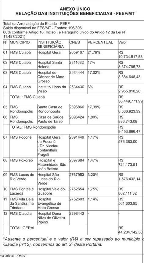 Dos recursos destinados Rondonópolis recebeu R$ 9, 4 milhões, sendo R$ 8,5 milhões para a Santa de Misericórdia e R$ 866 mil para o Hospital Psiquiátrico Paulo de Tarso. De acordo com o parlamentar os valores foram destinados aos 11 hospitais filantrópicos contemplados pelo recurso, sendo os municípios os responsáveis pelo direcionamento do recurso às instituições beneficiadas. “Acredito que a maioria dos municípios já estão com os recursos creditados nas contas das prefeituras”, disse o Nininho.