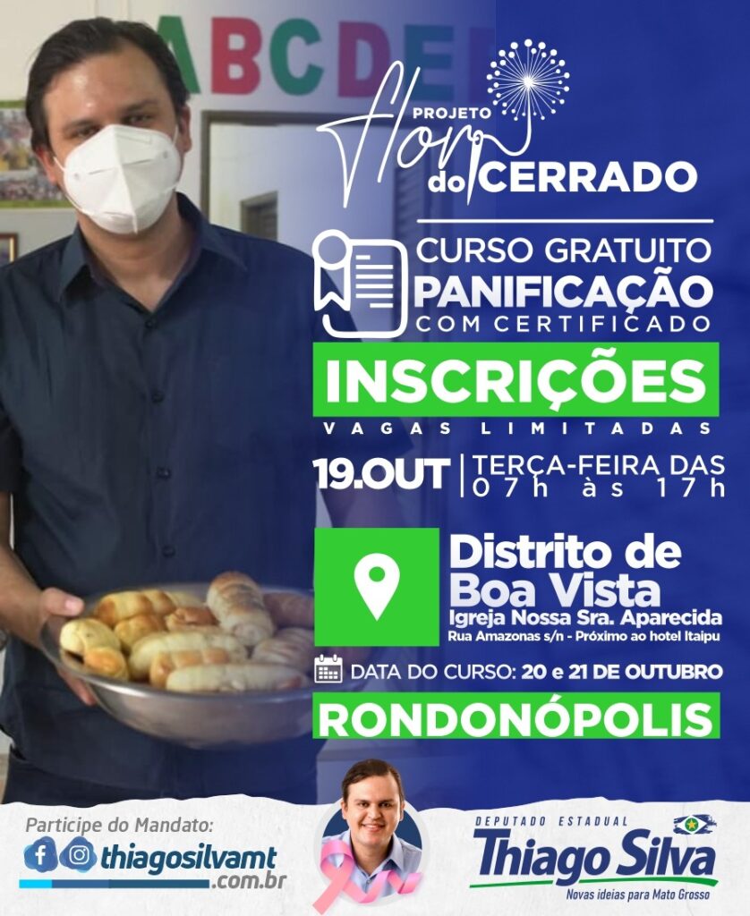 O deputado estadual Thiago Silva (MDB) abrirá nesta terça-feira (19) inscrições para o curso de panificação do seu projeto Flor do Cerrado no Distrito de Boa Vista em Rondonópolis. A solicitação do curso foi um pedido dos moradores da região para o deputado.