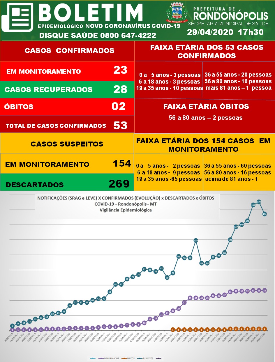 A cidade de Rondonópolis completou hoje (29) mais um dia sem novos casos de Covid-19, desde a última segunda-feira, os números estão estacionados em 53 casos confirmados.