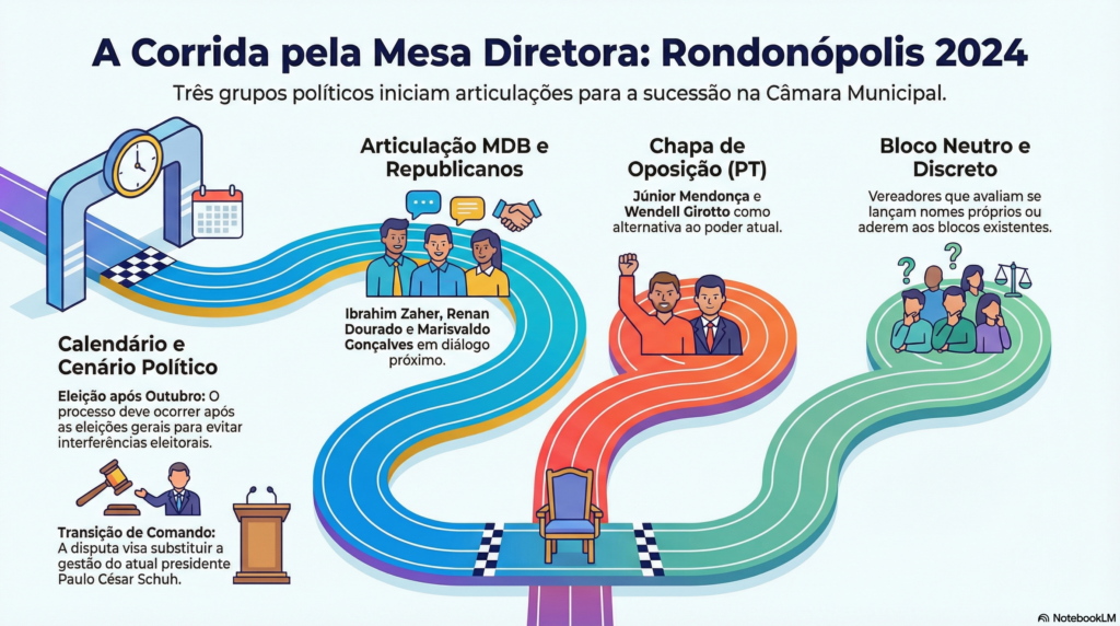 Pelo menos três grupos políticos já se articulam nos bastidores para a disputa da Mesa Diretora da Câmara Municipal de Rondonópolis, cujo processo eleitoral deve ocorrer no final deste ano, com o encerramento do mandato do atual presidente do Legislativo, o vereador Paulo César Schuh (PL).