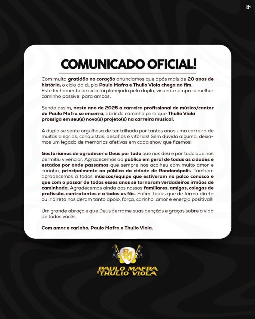 Conforme o texto divulgado, 2025 será o ano de encerramento da parceria, marcando o início de novos desafios profissionais para Thulio Viola. “Sendo assim, neste ano de 2025 a carreira profissional de músico/cantor de Paulo Mafra se encerra, abrindo caminho para que Thulio Viola prossiga em seu(s) novo(s) projeto(s) na carreira musical”, destaca a nota.