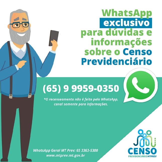 O Mato Grosso Previdência (MT Prev) informa que disponibilizou um número de WhatsApp exclusivo para os aposentados e pensionistas que queiram consultar se o processo de recadastramento do Censo Previdenciário foi validado, entre outras informações.
