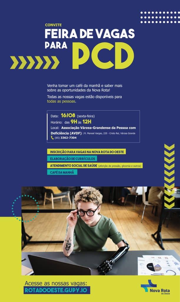 A Nova Rota do Oeste realiza, nesta sexta-feira (16), na sede da Associação Várzea-Grandense da Pessoa com Deficiência, evento destinado a pessoas com deficiência (PCDs) em busca de emprego. A ação contará com apoio na elaboração de currículos, exames rápidos de profilaxia e palestras educativas sobre saúde e diversidade no ambiente de trabalho, das 9h às 12h. Os serviços são gratuitos.