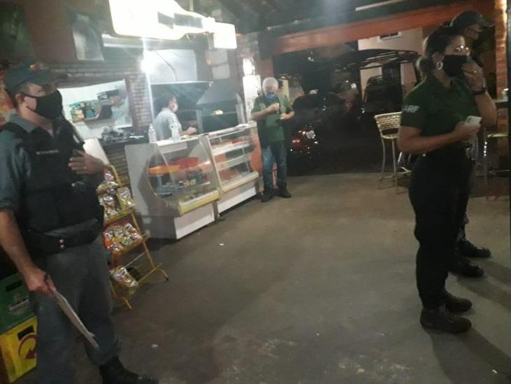 Policiais militares do 1º BPM e agentes da prefeitura de Cuiabá autuaram na noite desta terça-feira (05.005), o proprietário de um estabelecimento comercial por promover aglomeração e por pessoas estarem sem máscara, no bairro Porto.