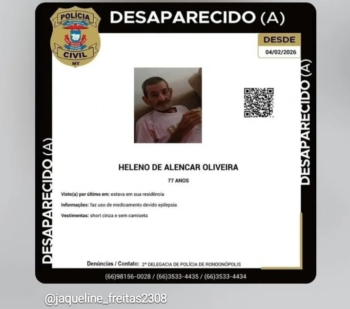 A família do idoso Heleno de Alencar Oliveira, de 77 anos, está desesperada à procura de informações sobre seu paradeiro em Rondonópolis (MT). Ele está desaparecido desde a noite do dia 4 de fevereiro e, até esta quarta-feira (11), ainda não foi localizado.