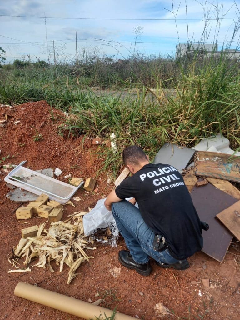 Neste local os agentes localizaram os seguintes materiais: sacolas plásticas, um capacete, garrafas pet, frascos aerosóis, entulhos de lixo de limpeza de quintal e construção, além de papelões e lixo doméstico. Os policiais encontraram em meio ao lixo, 01 (um) cartaz de felicitações à aniversariante de 46 anos de idade (suspeita), além de um recibo de pagamento de salário em nome da mesma. Então, diante dos fatos, os policiais efetuaram o registro fotográfico dos fatos o que eventualmente comprova o delito de crime ambiental.