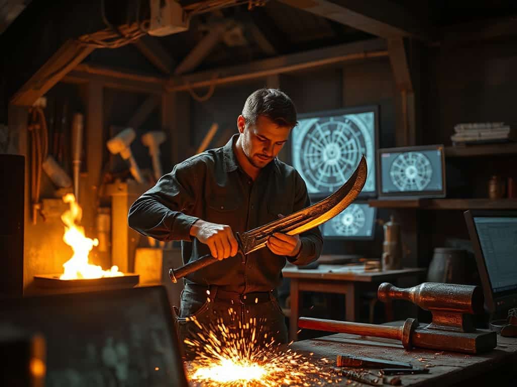 Essa parceria entre habilidade humana e tecnologia moderna permite que os ferreiros produzam lâminas que são ao mesmo tempo artísticas e funcionais.