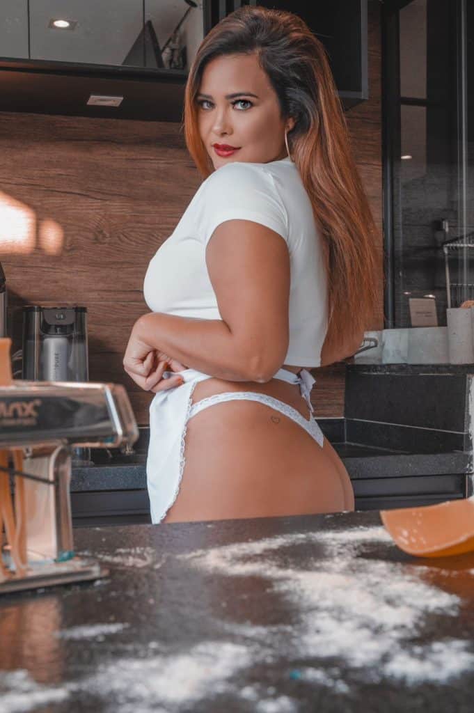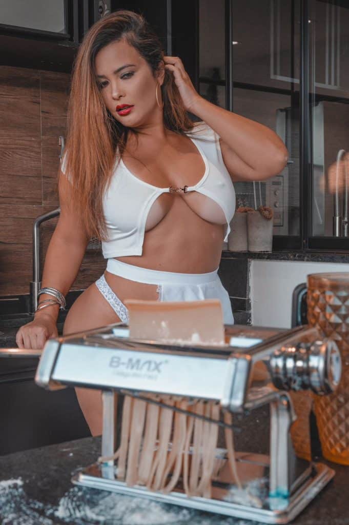 Com direito a farinha e massas, a escritora abusou do decote preparando uma massa italiana para suas plataformas de conteúdo adulto.