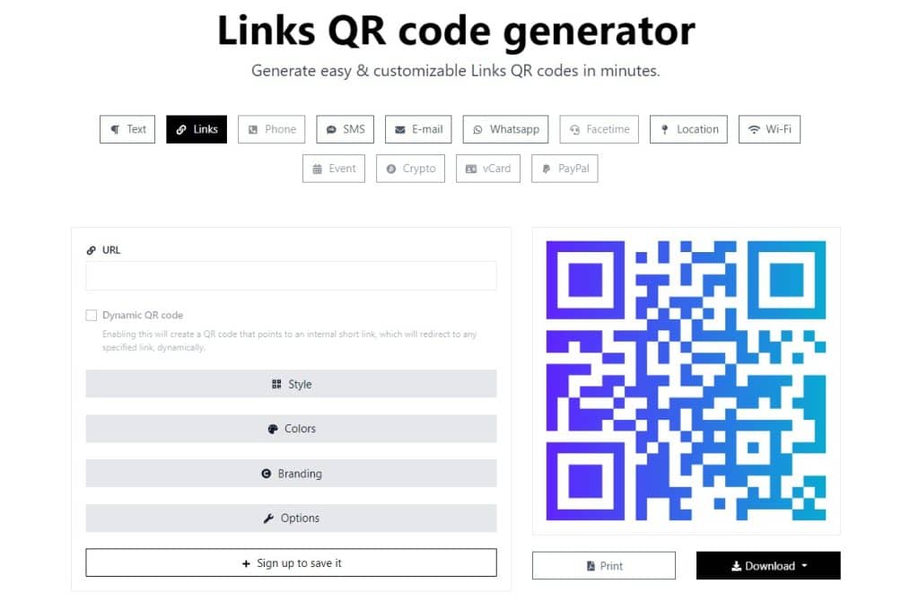 Você pode gerar QR code permanente (estático) para um URL, texto, cartão de visita virtual, endereço de e-mail, número de telefone para SMS, senha de Wi-Fi ou endereço de carteira de criptomoeda.