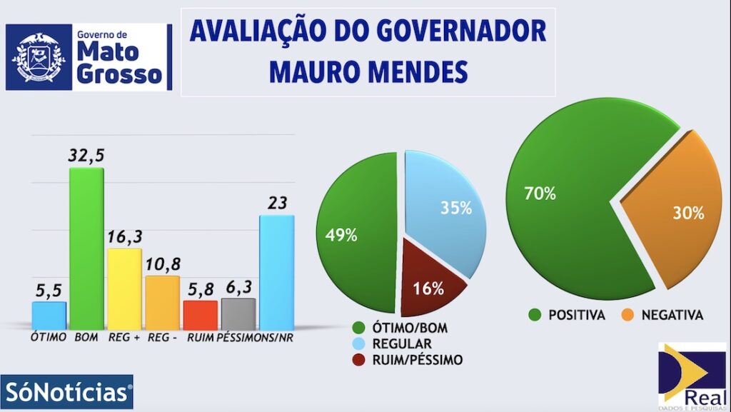 A gestão do governador Mauro Mendes (União), candidato à reeleição, foi avaliada como positiva para 72% dos eleitores de Sinop, conforme pesquisa Real Dados, em parceria com o Portal Só Notícias.Para 32,5% dos entrevistados, Mauro faz um bom governo e 5,5% acham que é ótimo. Outros 16,3% dos entrevistados, consideraram que a gestão Mauro Mendes é regular positivo.Por outro lado, 30% das pessoas ouvidas pela pesquisa avaliaram a gestão do atual governador como negativa. Desse total, 10,8% consideraram regular negativo, 5,8% ruim e 6,3% avaliaram como péssimo. Não sabem ou não responderam representam 20% dos entrevistados.A Real Dados entrevistou 400 eleitores entre os dias 20 e 21 de agosto, em todos os bairros de Sinop. A pesquisa foi contratada pelo Portal Só Notícias e está registrada no TSE com número MT-09287/2022. O intervalo de confiança é de 95% e a margem de erro é de 4,8% para mais ou para menos.