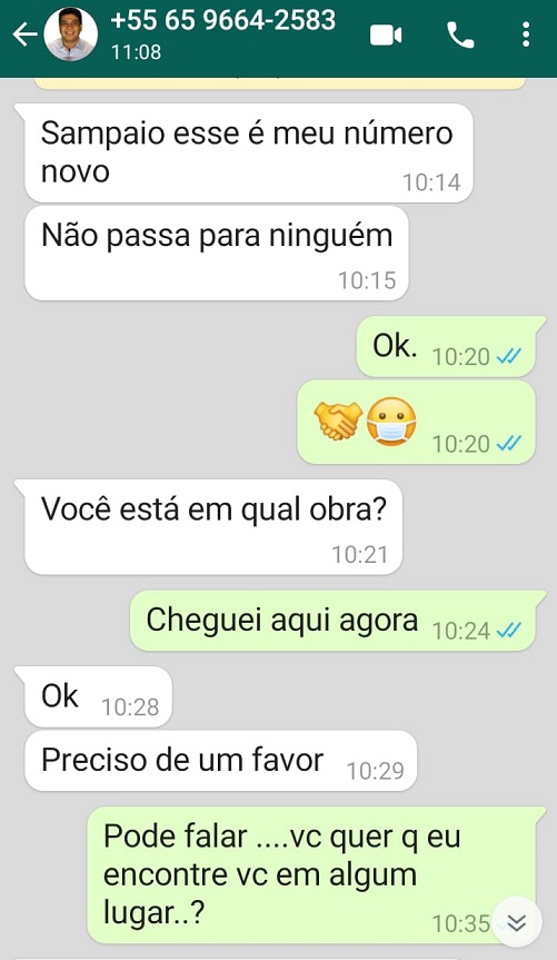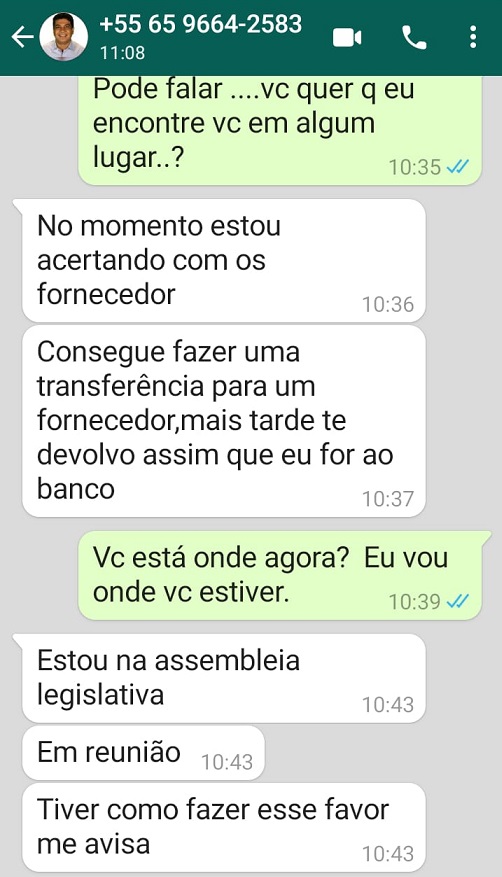 Na tentativa dessa manhã, as mensagens tiveram cunho mais intimista, com o interlocutor se passando por um servidor de segundo escalão que estaria numa suposta “reunião na Assembleia Legislativa” e que precisava de dinheiro para “pagar um fornecedor”. O tom da conversa chama à atenção e se mostra mais elaborado do que nas tentativas anteriores.