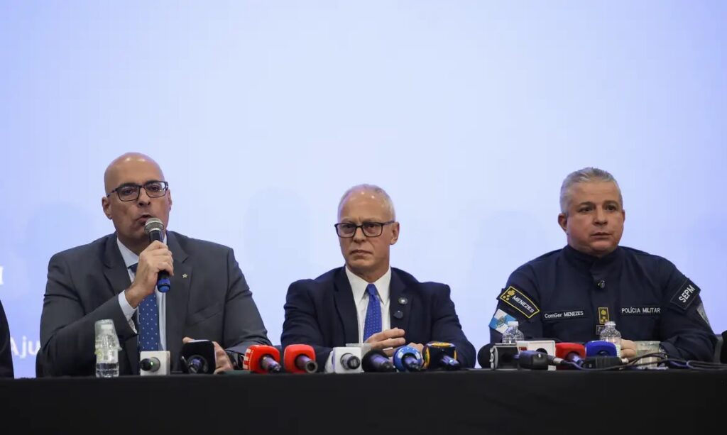 Rio de Janeiro (RJ), 26/10/2025 – Mesa com autoridades do Estado do Rio de Janeiro durante coletiva de imprensa sobre a Operação Contenção na Cidade da Polícia, no Rio de Janeiro. Foto: Tomaz Silva/Agência Brasil
