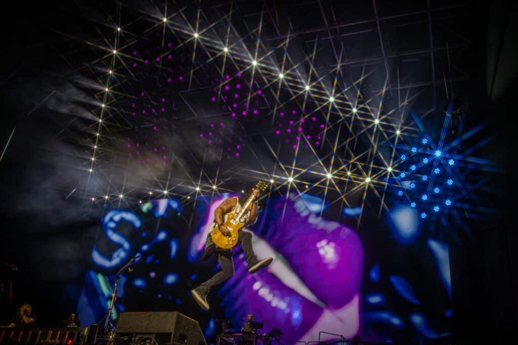 O guitarrista Slash protagonizou um dos momentos mais intensos da noite com um solo extenso e visceral, arrancando aplausos do público e reforçando sua posição como um dos maiores instrumentistas do rock.