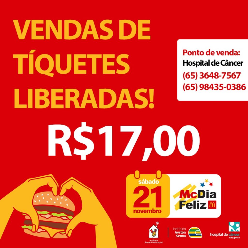 O Hospital de Câncer de Mato Grosso (HCanMT) já deu a largada para a campanha do McDia Feliz, que este ano será no dia 21 de novembro. O tíquete do lanche Big Mac no valor de R$ 17,00 está sendo comercializado por voluntários e na Central de Captação do Hospital, que funciona de segunda a sexta das 7h às 18h (sem intervalo para almoço) e sábado das 7h30 às 11h30.