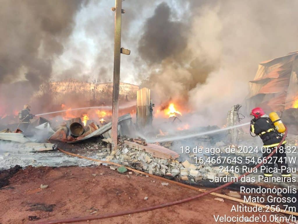 Um Incêndio destruiu uma empresa de reciclagem localizada no Distrito industrial Antigo, em Rondonópolis, na Madrugada deste Domingo (18).