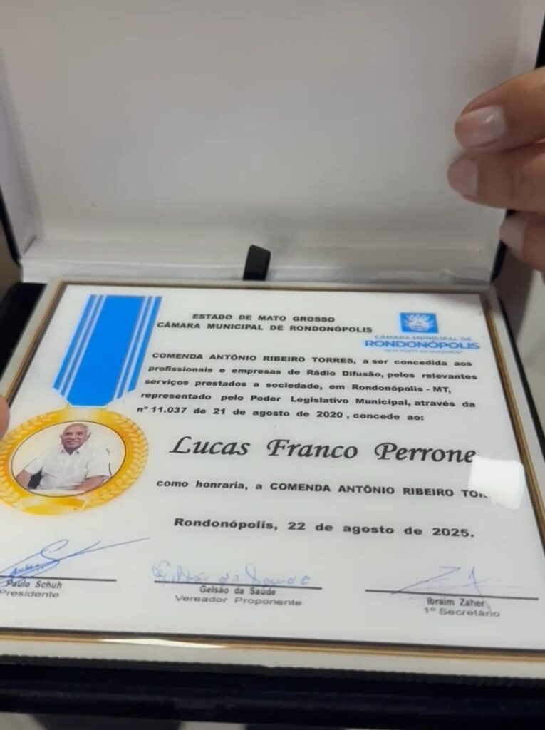 A comenda representa o reconhecimento pelo compromisso e dedicação de Lucas Perrone ao jornalismo e à informação de qualidade prestada à população de Rondonópolis ao longo de quase três décadas de carreira.
