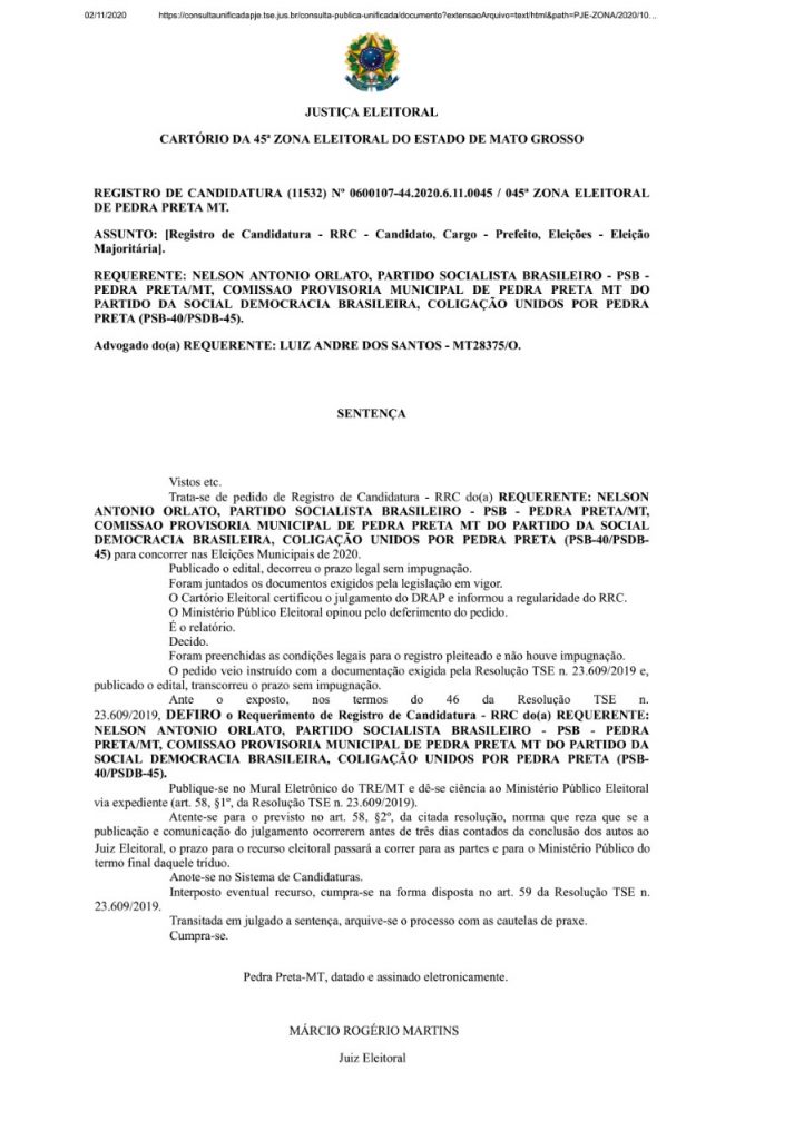 O Juiz Eleitoral Mário Rogério Martins, da 45ª Zona Eleitoral de Pedra Preta confirmou, sem qualquer ressalva, o registro de candidatura do candidato a prefeito de Pedra Preta Nelson Orlato (PSB).