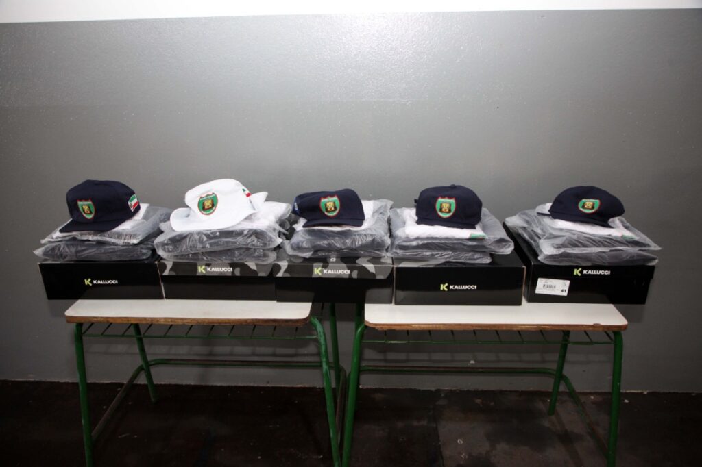 O conjunto é renovado anualmente e composto por calça, gandola militar (parte superior da farda), duas camisetas, coturno e gorro, adquiridos com recursos próprios do Município e os coletes a prova de balas e placa balística. No próximo mês, serão entregues os uniformes de passeio.